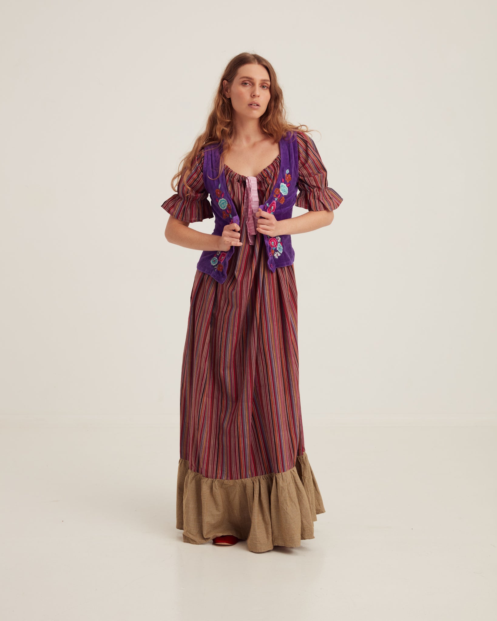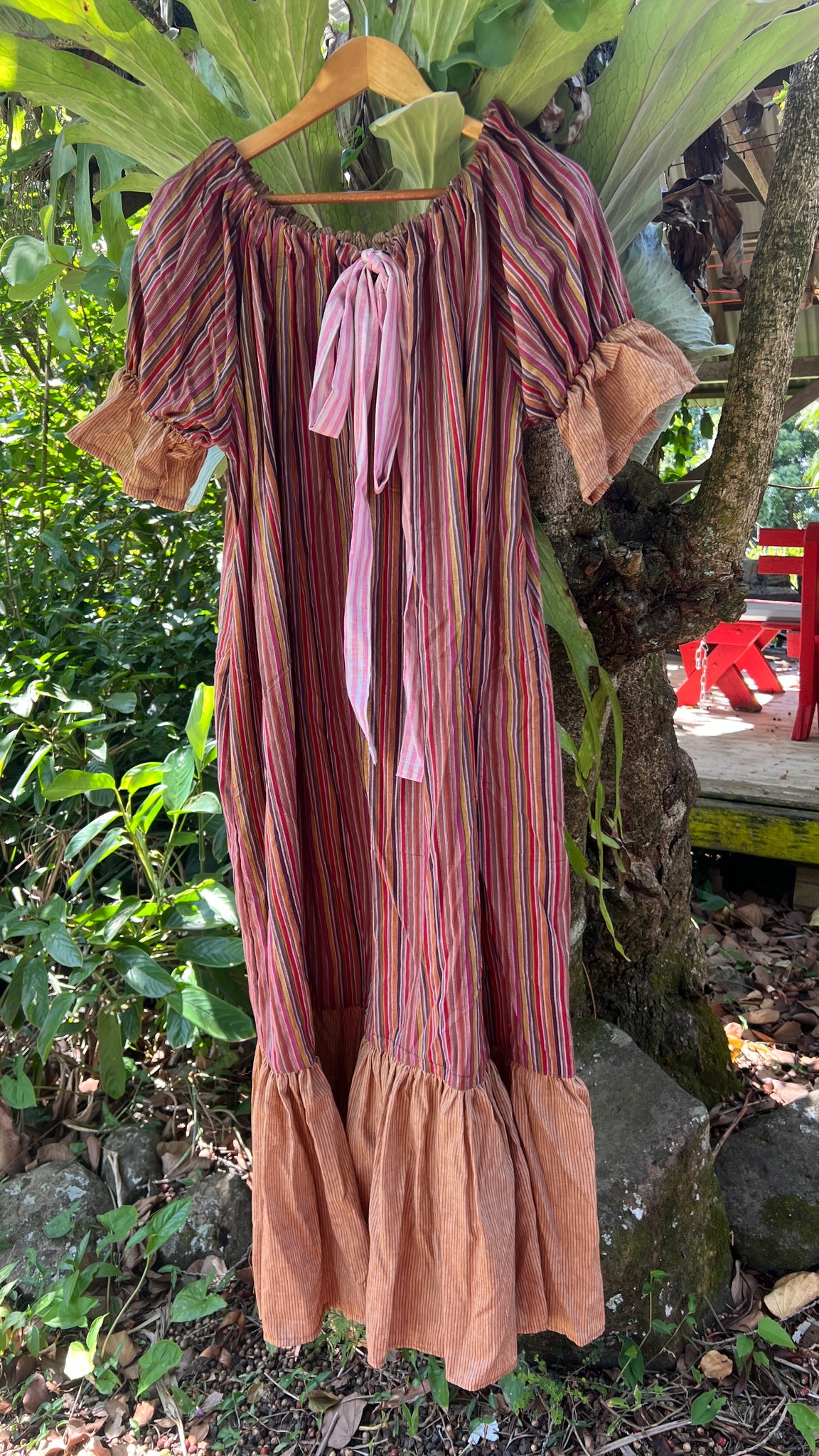 A one of a kind patchwork Tiramisu Dress featuring mocha stripe frill sleeves, wine stripe front and back, pink stripe adjustable necktie and mocha frill at hem (as shown in the second image).