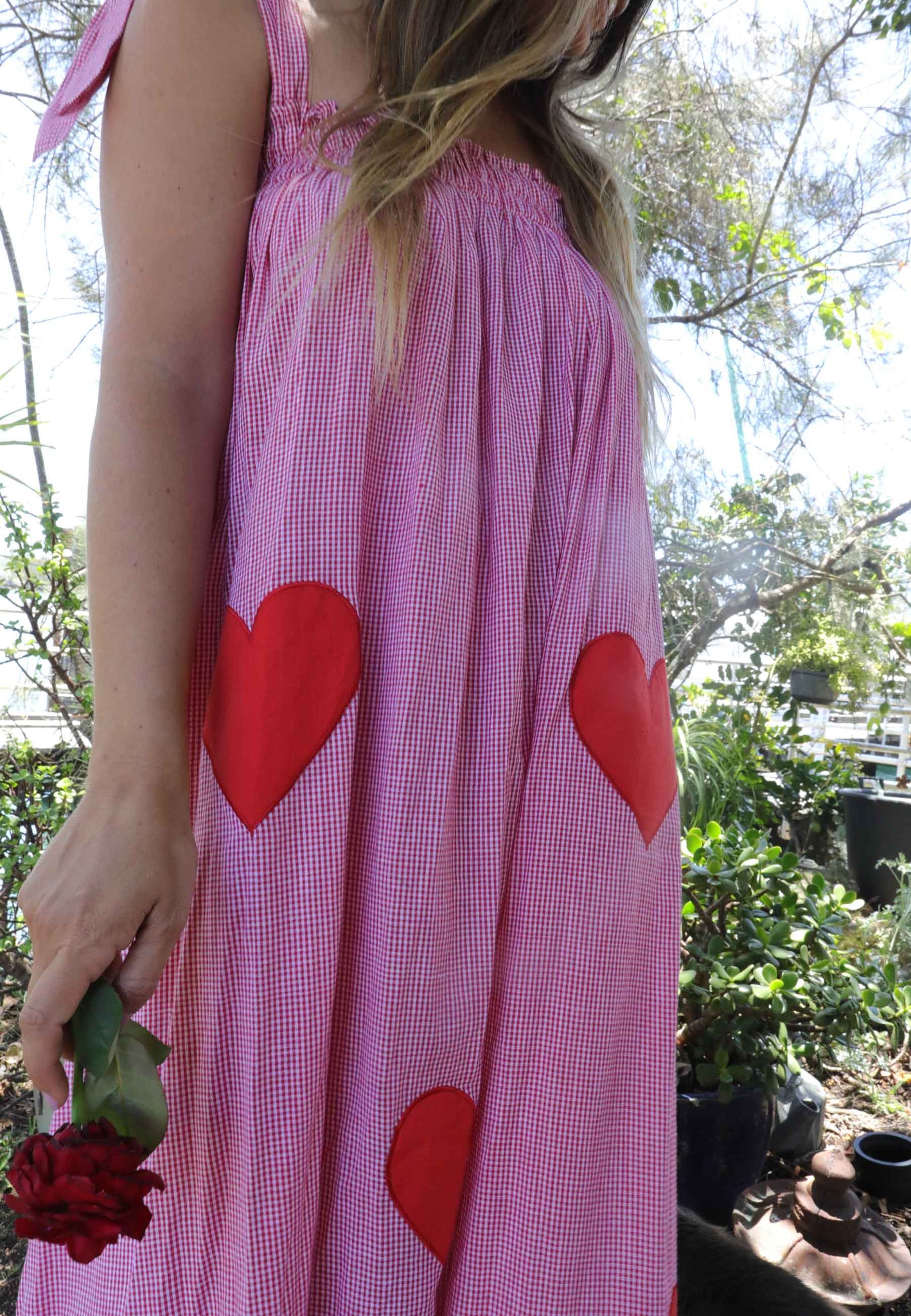 The Lorraine Dress pays homage to heirloom dresses passed down by my mother. This fabulous Queen of Hearts version features red loveheart appliqués and red gingham Indian cotton voile. The ultimate feel-good frock.