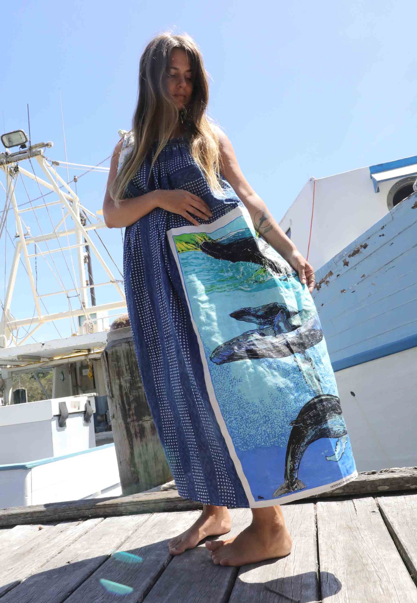 Woman wears a patchwork dress featuring whales and indigo indian cotton