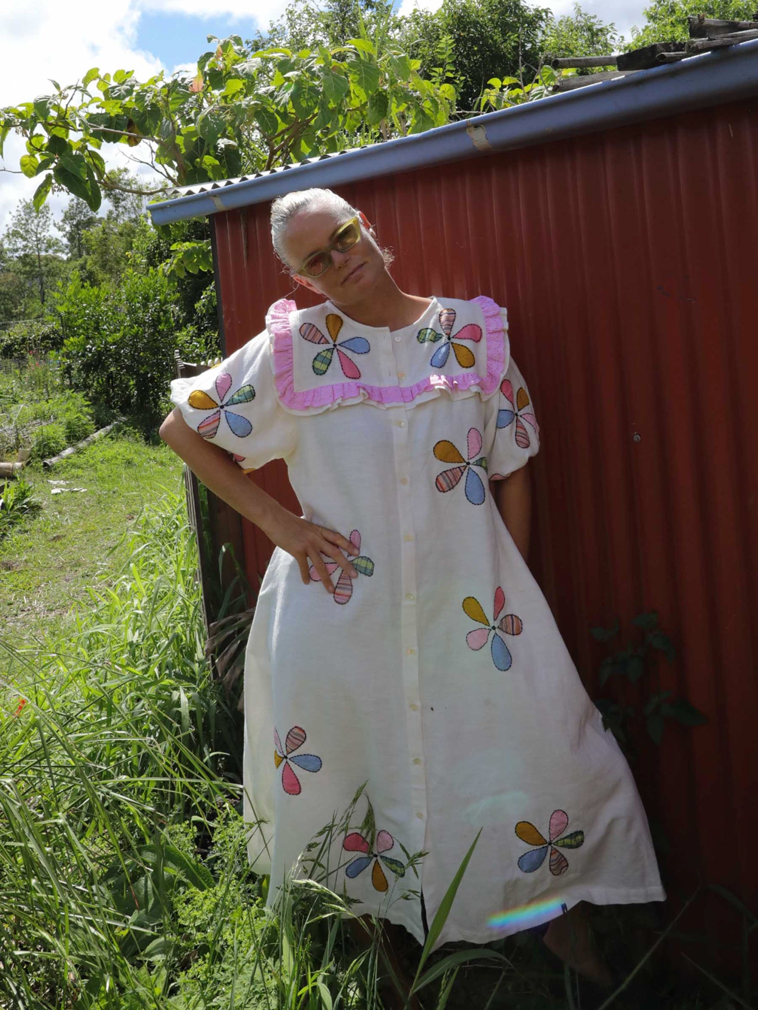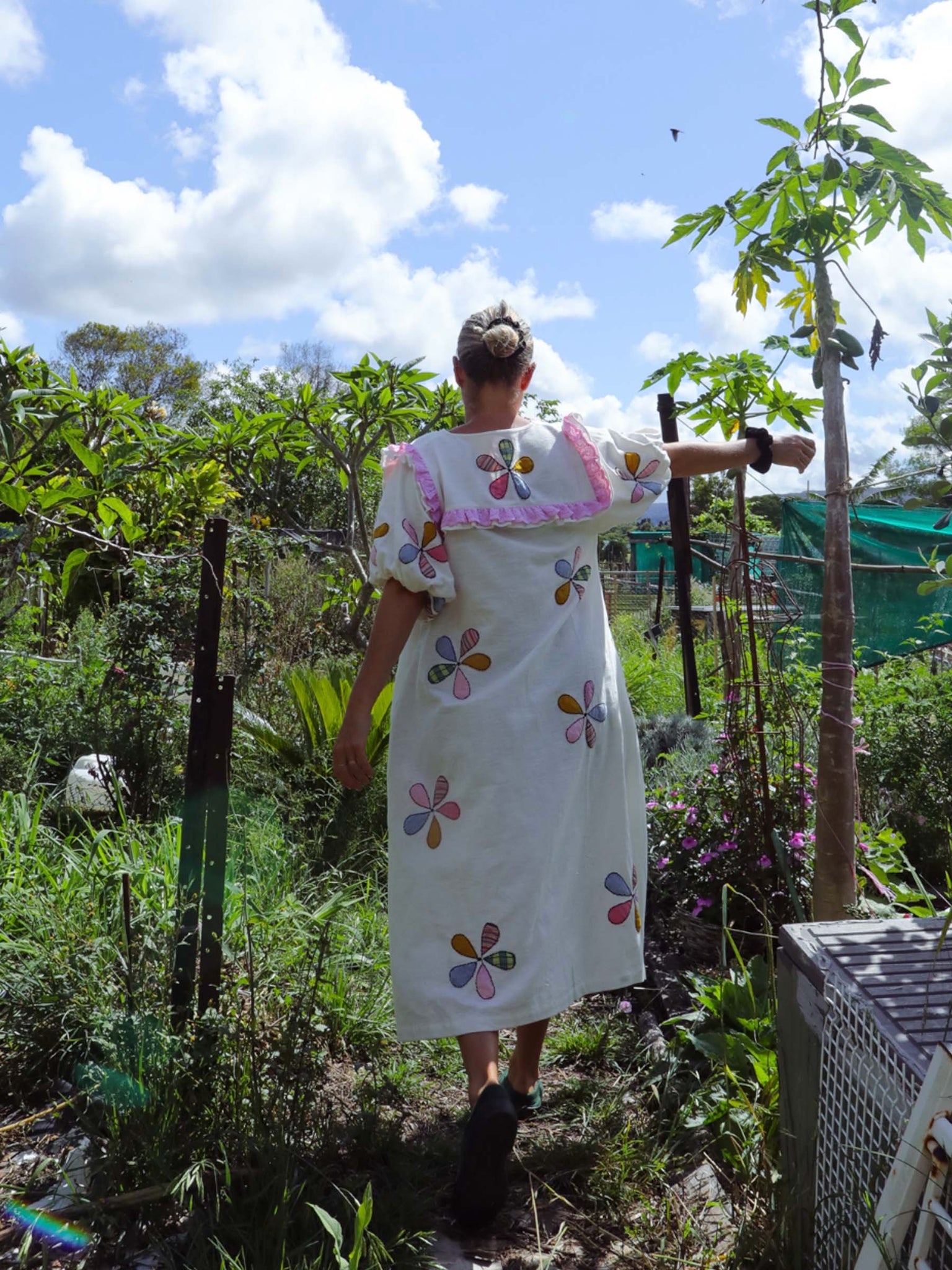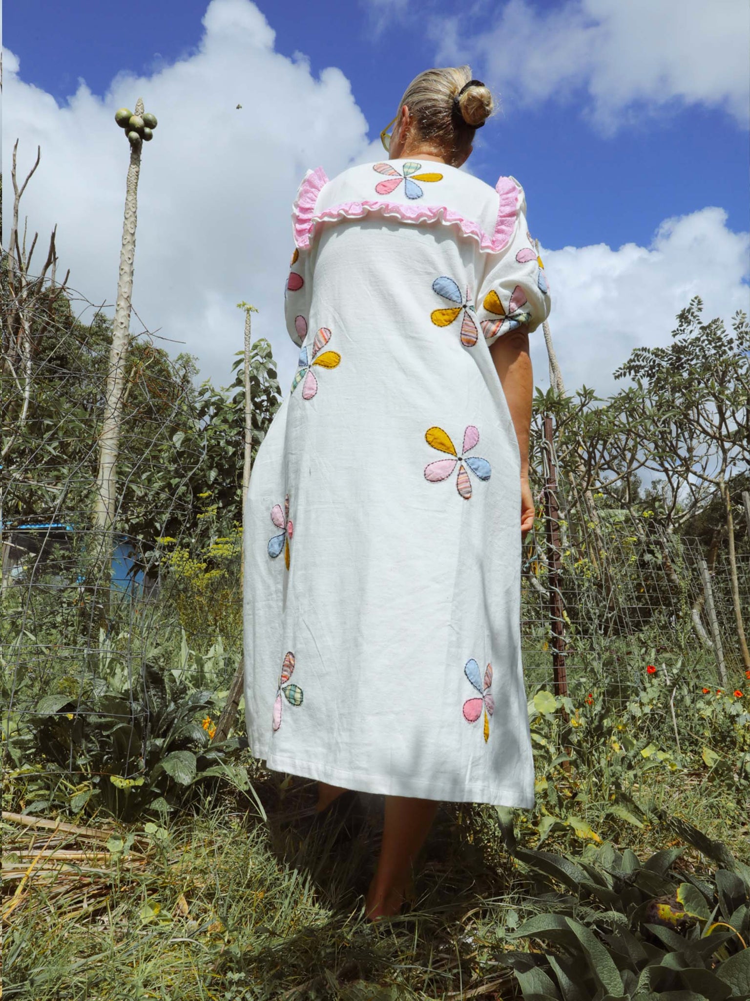 The Windmill Smock reminds me of my Aunty Jean’s garden, full of flowers and love and a noisy but majestic windmill. I created her in our dreamy, mid-weight Indian cotton with rainbow pinwheel appliqués to bring you some of the magic of that garden. Think dancing butterflies, buzzing bees, tumbling flowerbeds and the soft scent of freshly baked scones and the whistling of a pot of hot tea.