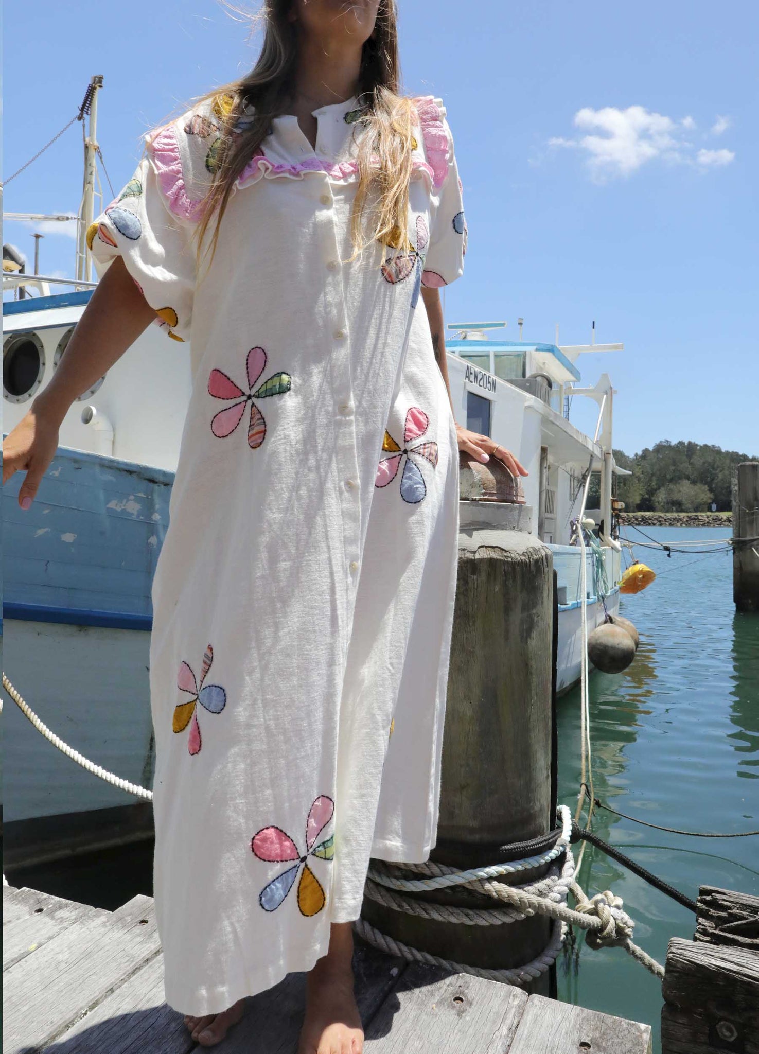 Featuring round neck, button through, puffy fabulous sleeves, side pockets, fancy frills and the gorgeous easy wear smock shape reminiscent of your favourite vintage dresses.